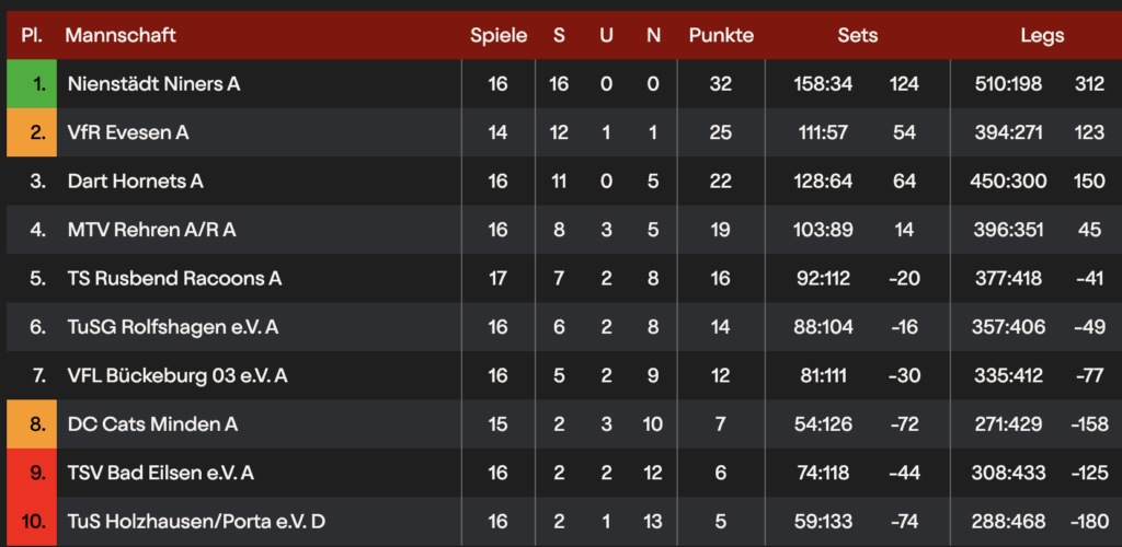 Der nächste Verfolger, VfR Evesen A auf Platz 2, hat bei zwei Spielen weniger bereits eine Niederlage und ein Unentschieden auf dem Konto – und kommt trotzdem nicht näher. Dahinter folgen die Dart Hornets A auf Rang 3 mit 22 Punkten, die aber schon fünf Niederlagen mitschleppen. Rusbend selbst, der heutige Gegner, findet sich auf Platz 5 wieder – mit negativer Set- und Legdifferenz, aber wie heute gezeigt: mit Charakter und Kampfgeist.