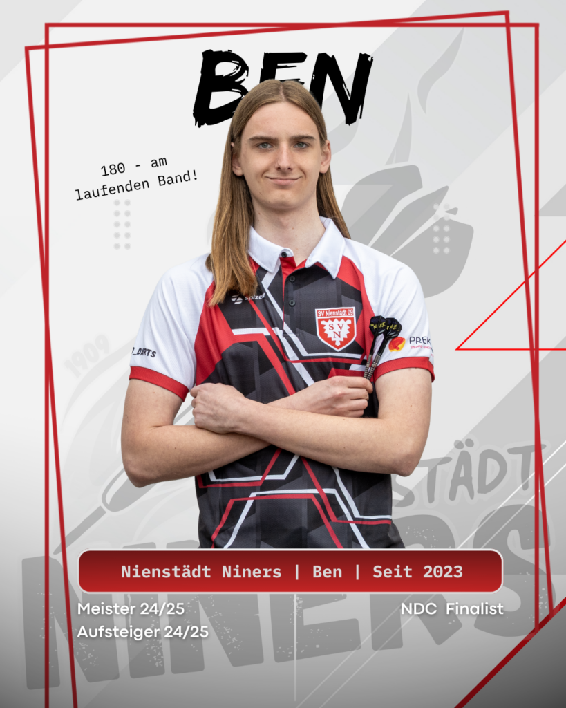 Auch bei der legendären NDC zeigte Ben seine Klasse und spielte sich bis in die Finalrunde, wo er nur schwer zu stoppen war. In der aktuellen Saison verstärkt er die Niners B-Mannschaft und bringt dort Präsenz, Erfahrung und Durchsetzungskraft ans Oche.