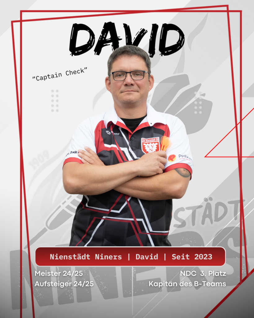 Sein Motto „Niemals aufgeben“ lebt er konsequent am Board – gepaart mit dem Anspruch, immer Spaß am Darts zu haben. Als Spieler und Kapitän verbindet David Wettkampfgeist mit Teamspirit und sorgt dafür, dass die B-Mannschaft geschlossen und fokussiert auftritt.
