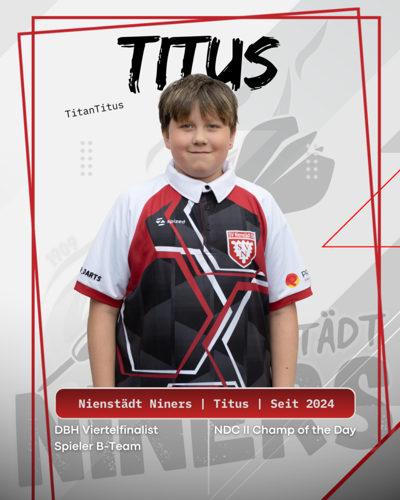 Titus ist ein Nachwuchsspieler, den man immer auf der Rechnung haben muss. Sein sauberer, technisch guter Wurfstil, kombiniert mit hohem Scoring und sicheren Checkouts, machen ihn zu einem der spannendsten jungen Spieler der Niners.